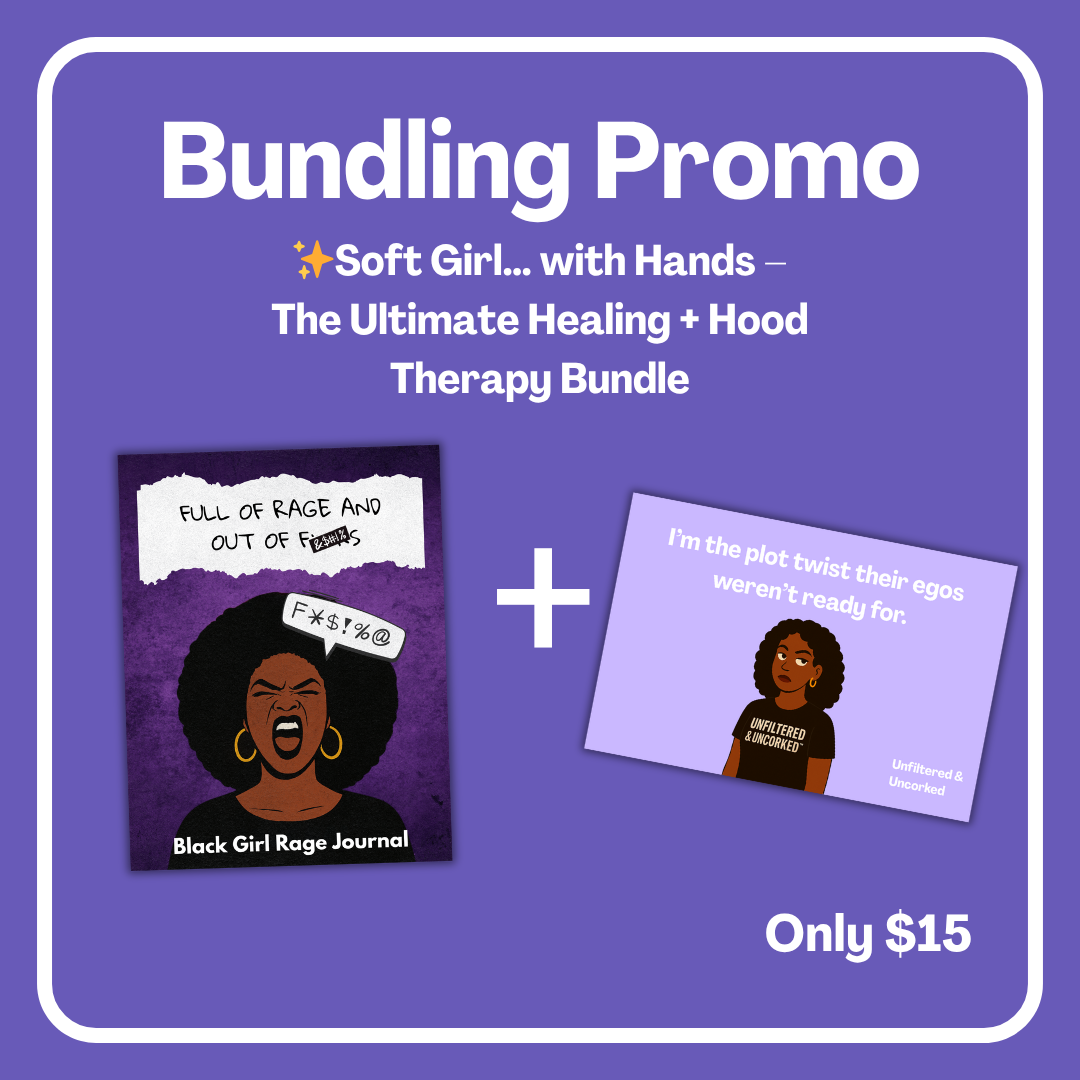 The ✨Soft Girl… with Hands – The Ultimate Healing + Hood Therapy Bundle gives you the best of both worlds: space to rage without apology and space to root for yourself without shame. It’s for the Black women who are working on their peace—but still got time if you wanna act up.